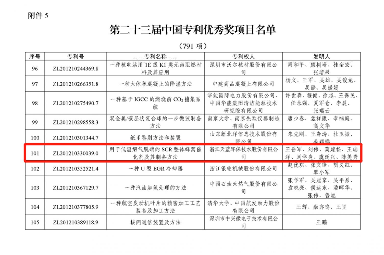 在剛剛揭曉的第二十三屆中國專利獎(jiǎng)中,我司發(fā)明專利“用于低溫?zé)煔饷撓醯腟CR整體蜂窩催化劑及其制備方法”榮獲中國專利獎(jiǎng)優(yōu)秀獎(jiǎng)。